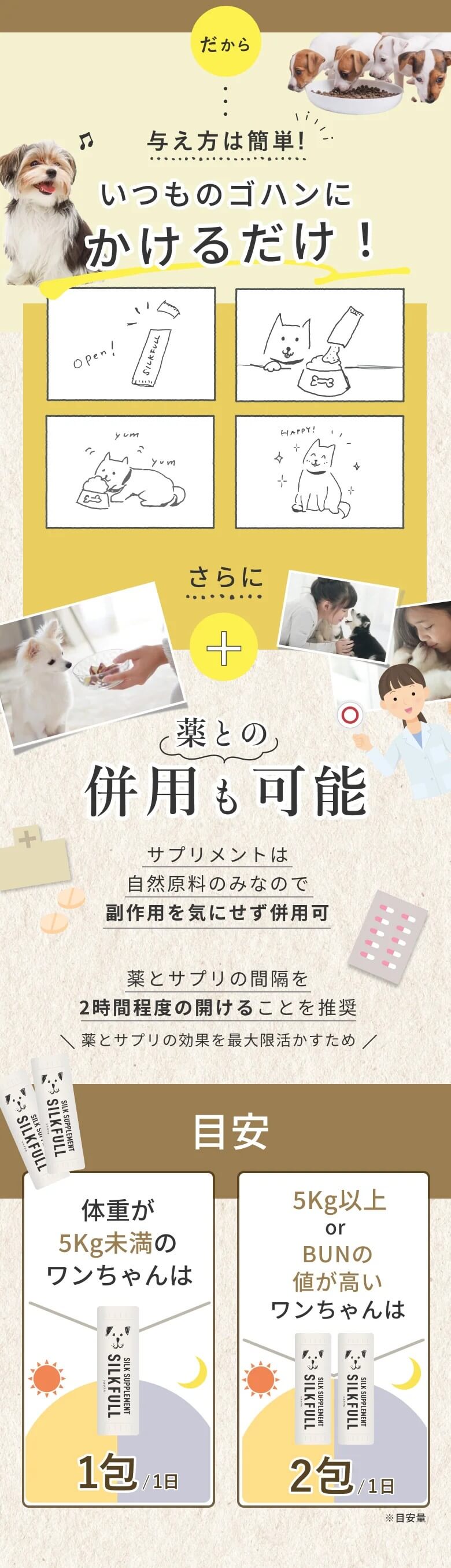 SILKFULL(シルクフル)は、ゴハンにかけるだけの犬用液体サプリメントです。