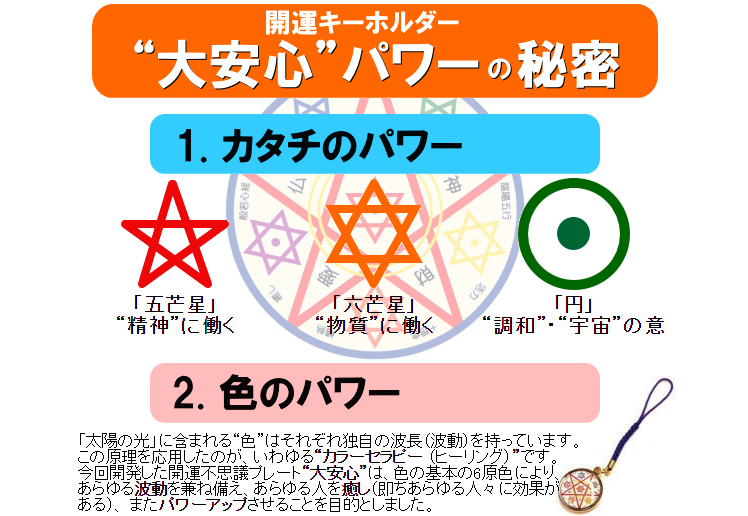 平安時代の不思議な 霊力をもった 陰陽師もトレードマークとして使用していた“五芒星”をも取り入れて『カタチ』と『色』と 『信霊(言葉)』の三種類の不思議なパワーを組み合わせた開運キーホルダー “大安心”を貴方の 開運のためのお守りとして。