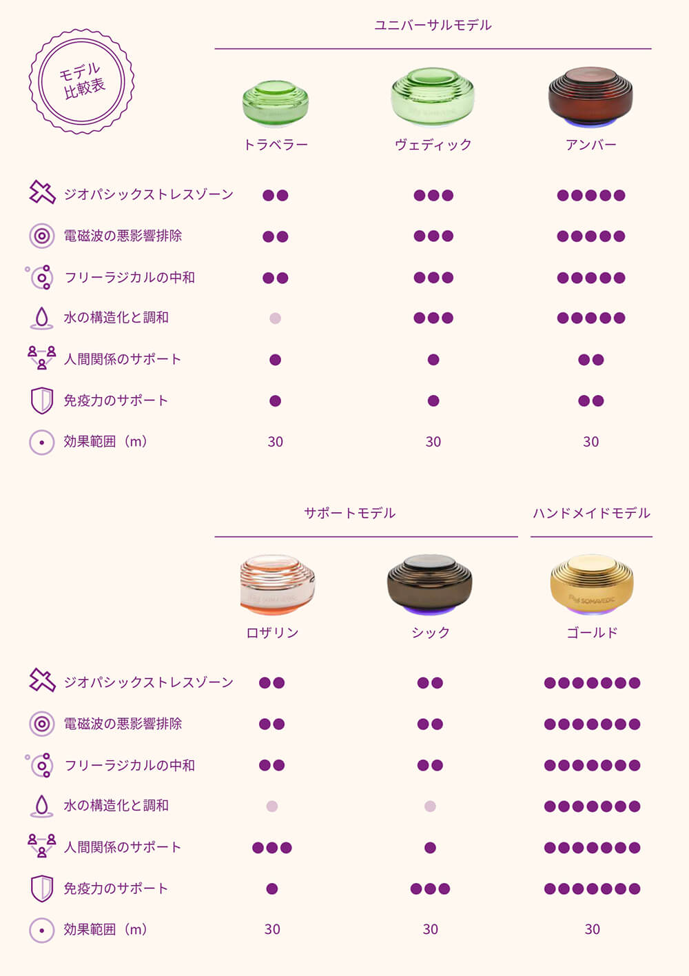 | 備考 | ※他のソマヴェディックシリーズ同様、どのような場所や環境下でも使用できます。 ※底面には、60℃の温度に達する3つのUV LEDダイオードがあります。 そのために熱くなる可能性がありますが、機器の機能上全く問題はございません。予めご承知おきください。 ※ソマヴェディックの1ヵ月間の消費電力は1KWH(1キロワットアワー)を超えません。1ヵ月間の電気料金は、約20円弱になります。どうぞご安心してソマヴェディックをお楽しみください。 |