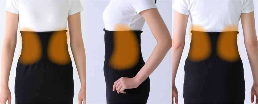 不安定な肋骨を支え、さらに骨盤、お尻、太ももにも触れ続けるサポート感と暖かさが安心感となり、緊張した体を緩めます。
