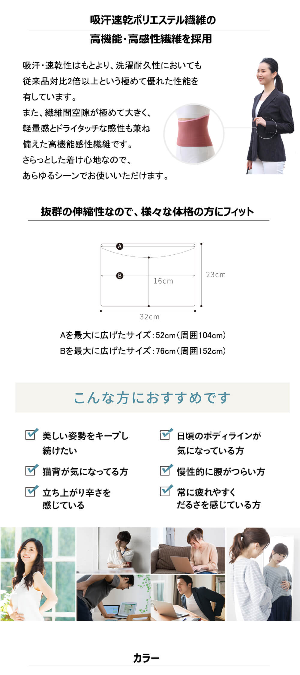 優しく体を包んで体幹をサポートするので、つけるだけで最適な姿勢をキープし、意識しなくてもいつでもどこでも、快適で美しい姿勢を保つことができます。