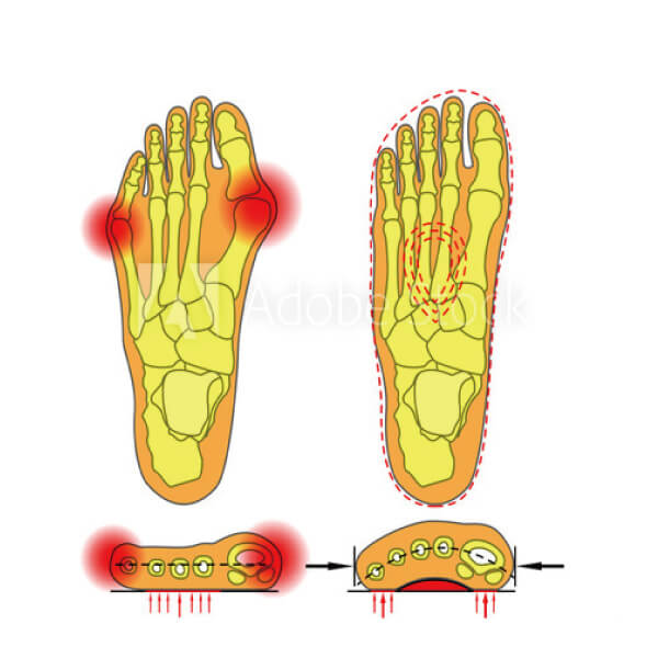 場合によっては、その積み重ねによって、足のもつ可動性の範囲を超えて痛みや変形を生じる原因となります。