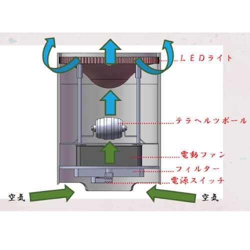 テラヘルツ素材を含む特殊セラミックボールに空気を送り込む独自の構造を採用しています。