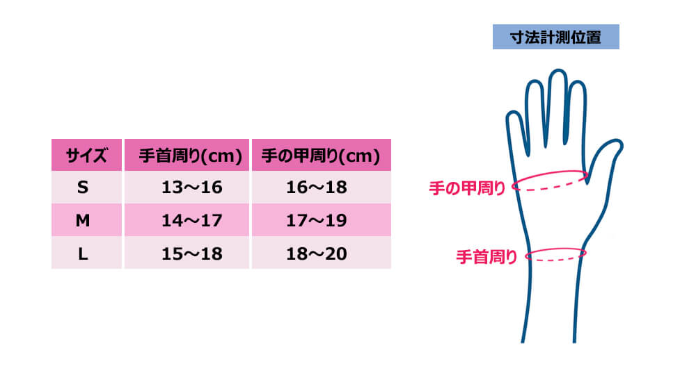S(手首周り13~16cm、手の甲周り16~18cm) M(手首周り14~17cm、手の甲周り17~19cm) L(手首周り15~18cm、手の甲周り18~20cm) |