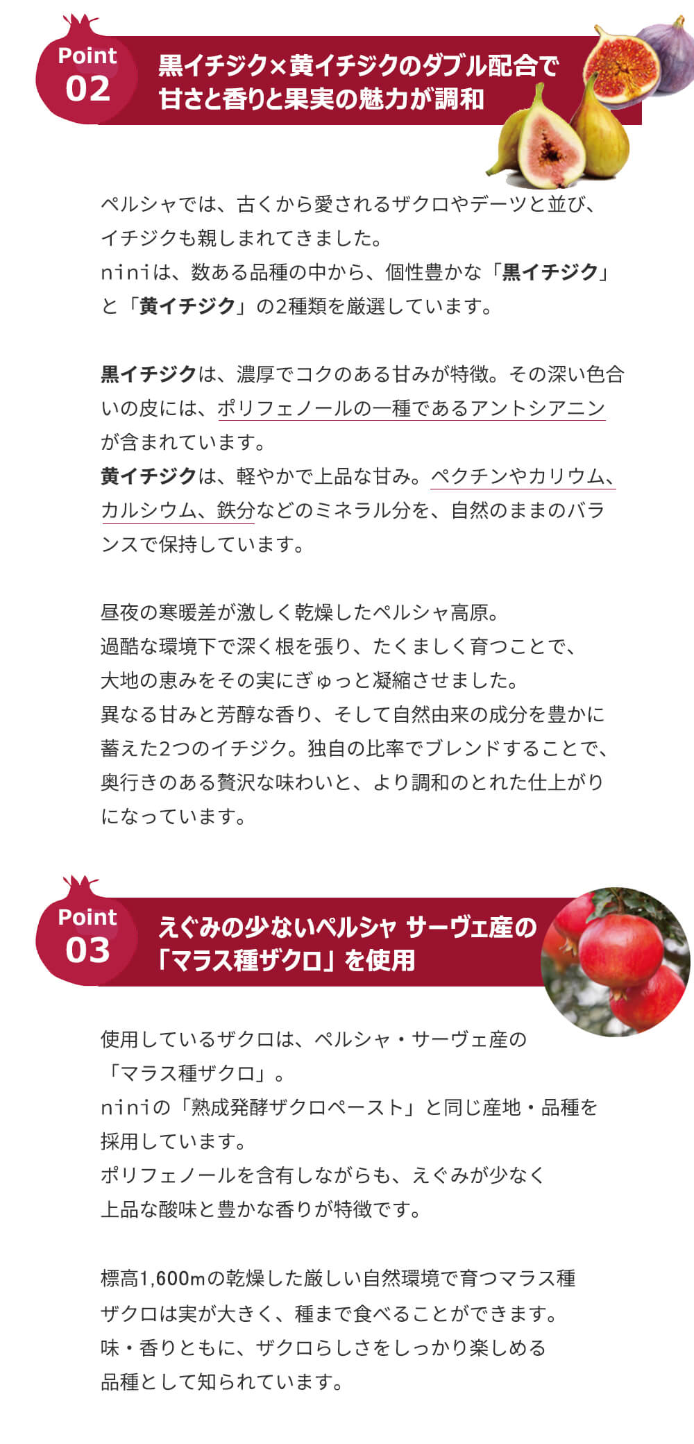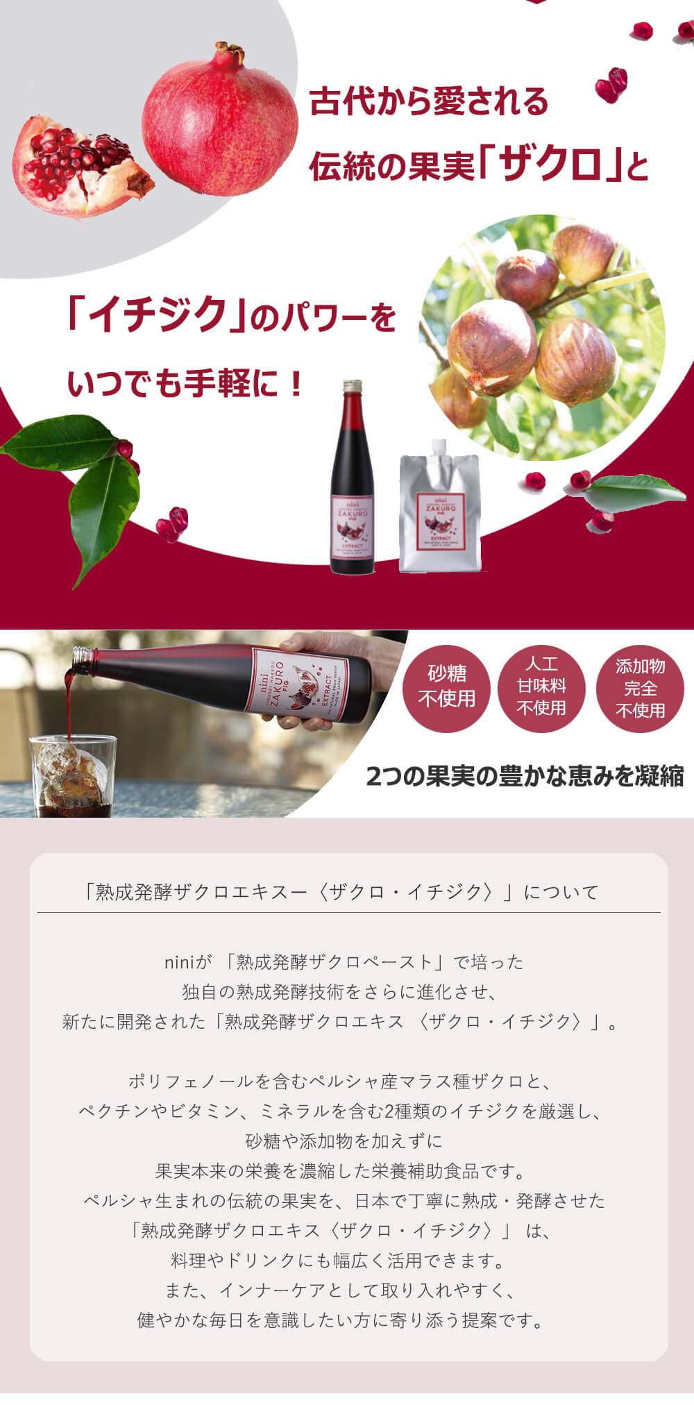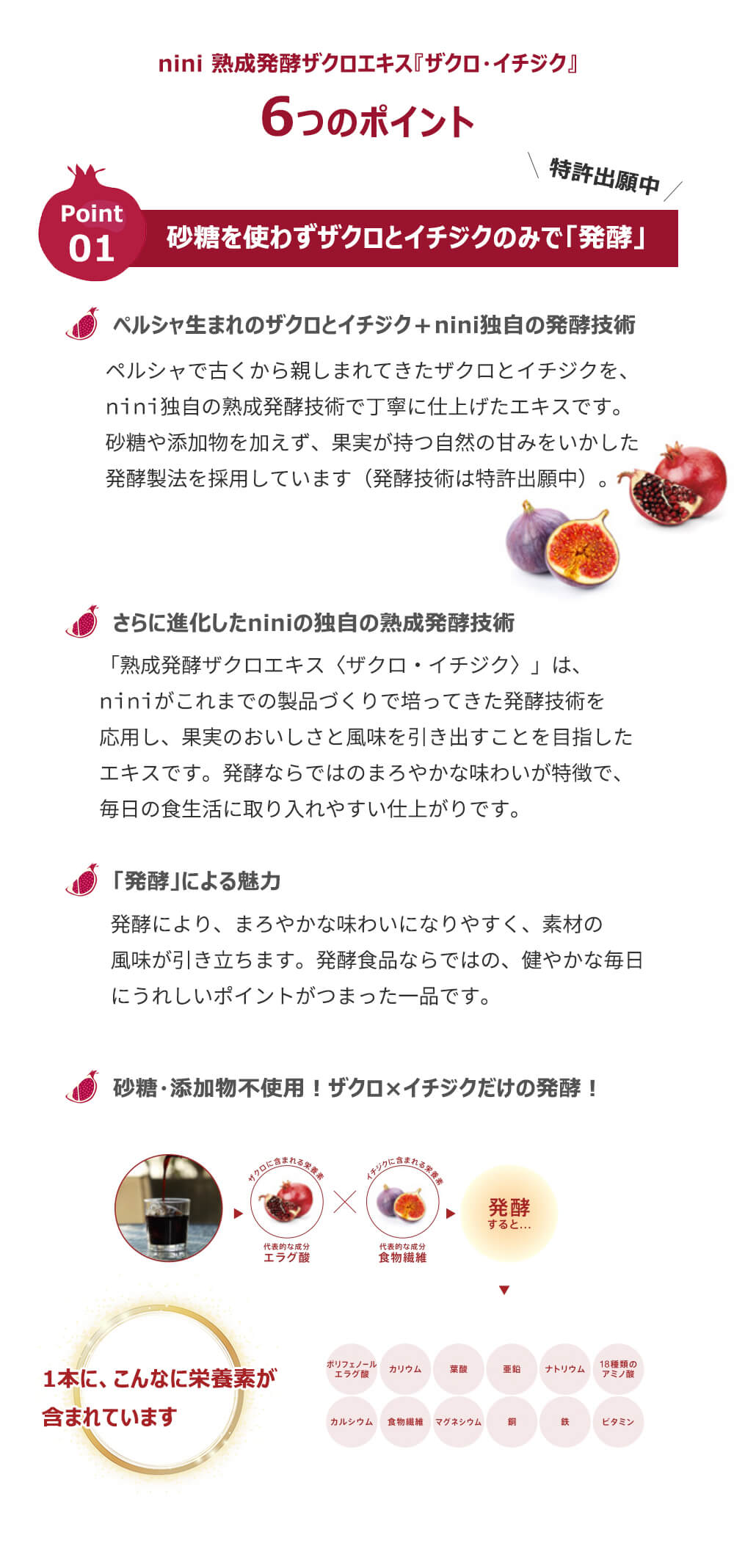 そして、nini独自の熟成発酵技術をさらに発展させ、ザクロと2種類のイチジクを組み合わせた「熟成発酵ザクロエキス(ザクロ・イチジク)」が誕生しました。