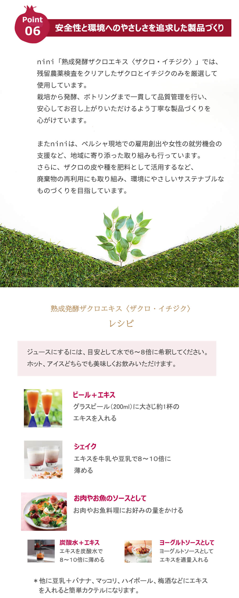 ペルシャ生まれの果実を、日本で丁寧に熟成・発酵させた「熟成発酵ザクロエキス(ザクロ・イチジク)」は、そのままはもちろん、料理やドリンクにも幅広くお使いいただけます。