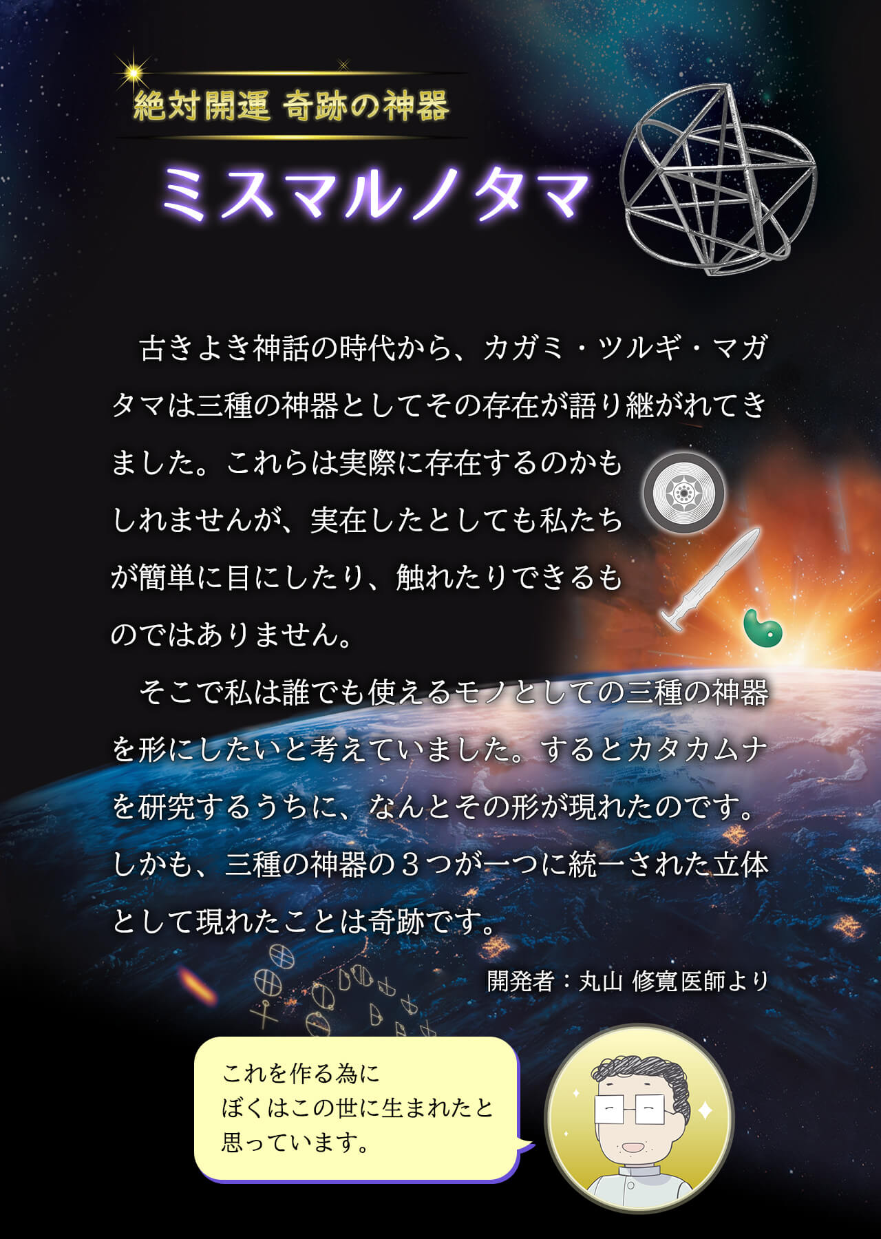 このミスマルノタマは生命エネルギーを強化し、タマシイを光輝かせる形として重要であると考えています。